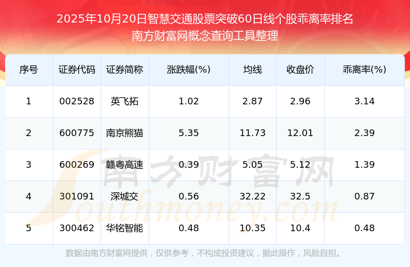 根據(jù)南方財(cái)富網(wǎng)概念查詢工具數(shù)據(jù)統(tǒng)計(jì),截止2025年10月20日收盤,智慧交通股票共有5只個(gè)股收盤價(jià)向上突破了60日線。其中乖離率較大的個(gè)股有英飛拓、南京熊貓、贛粵高速等,乖離率分別為3.14%、2.39%、1.39%。
