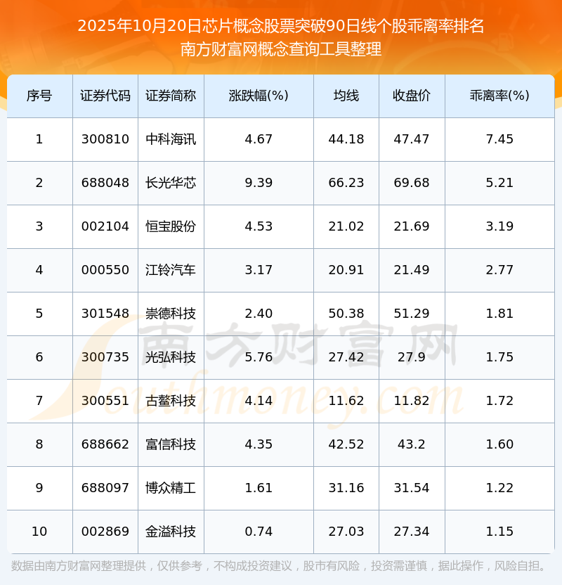 2025年10月20日芯片概念股票突破90日線個(gè)股乖離率排名