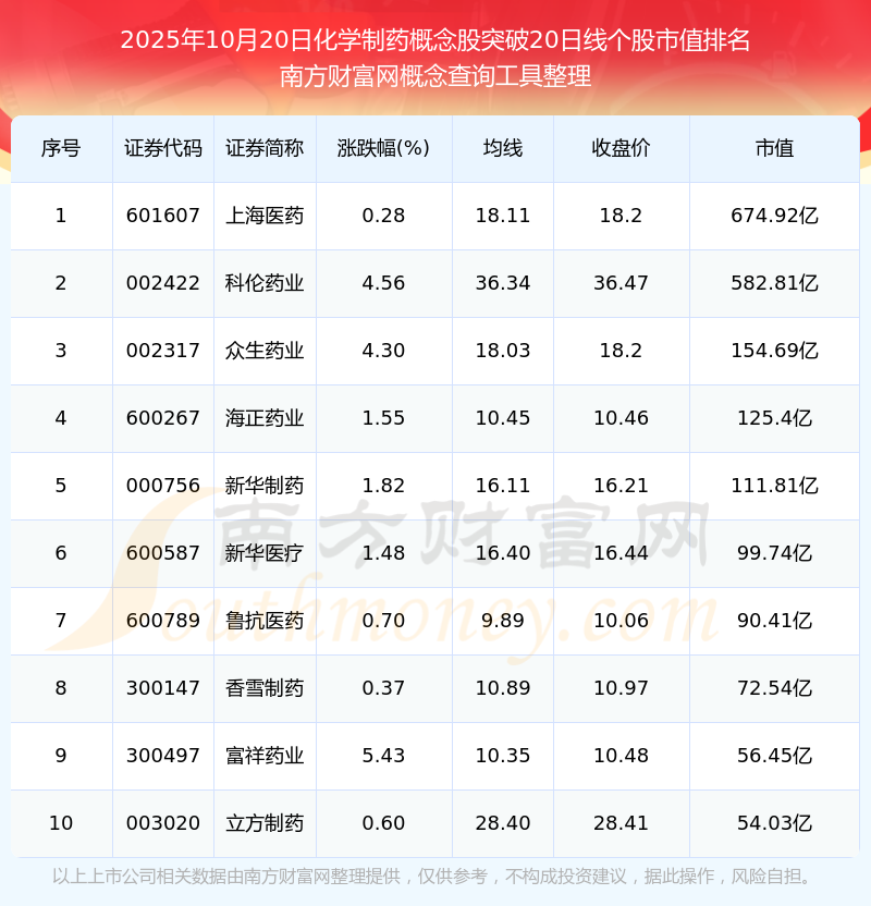 2025年10月20日化學(xué)制藥概念股突破20日線個(gè)股市值排名