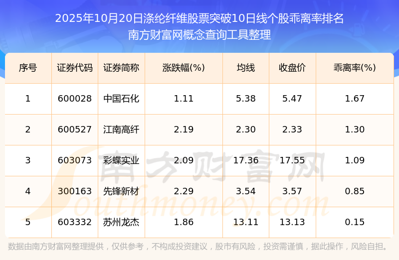 2025年10月20日滌綸纖維股票突破10日線個(gè)股乖離率排名