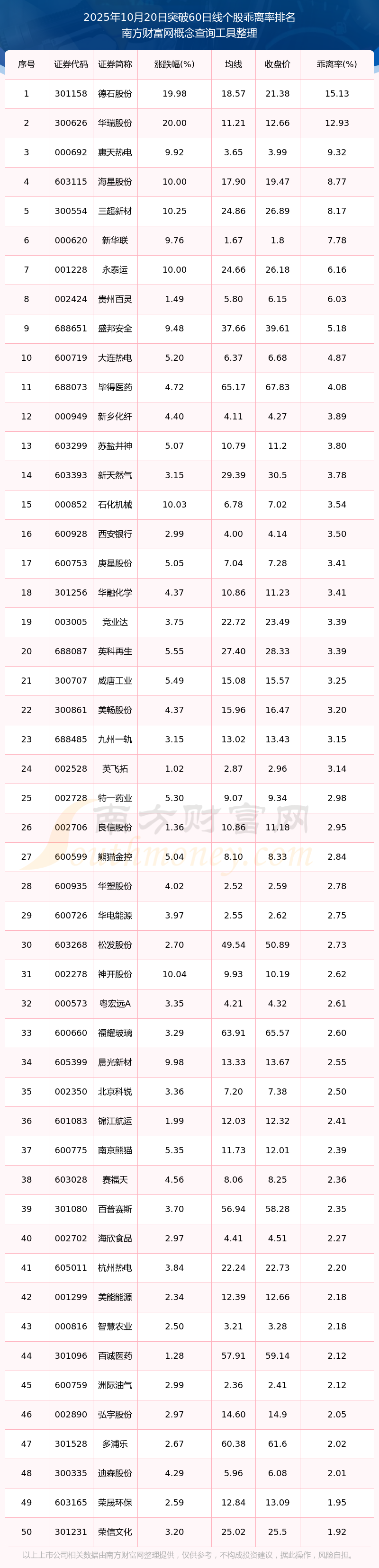 2025年10月20日突破60日線個股乖離率排名