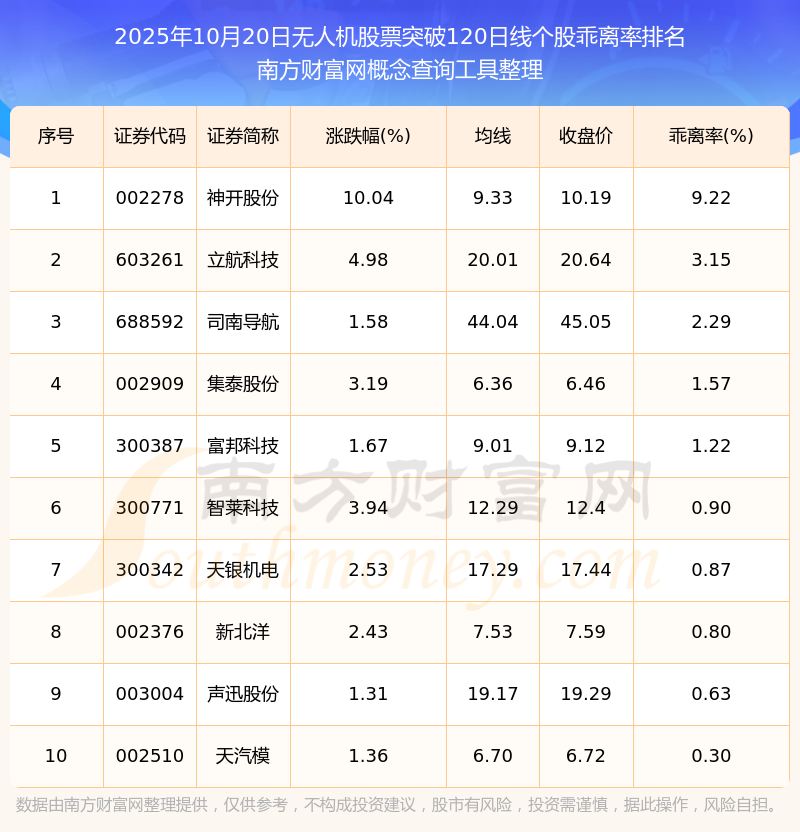 根據(jù)南方財(cái)富網(wǎng)概念查詢工具數(shù)據(jù)統(tǒng)計(jì),截止2025年10月20日收盤,無(wú)人機(jī)股票共有10只個(gè)股收盤價(jià)向上突破了120日線。其中乖離率較大的個(gè)股有神開股份、立航科技、司南導(dǎo)航等,乖離率分別為9.22%、3.15%、2.29%。
