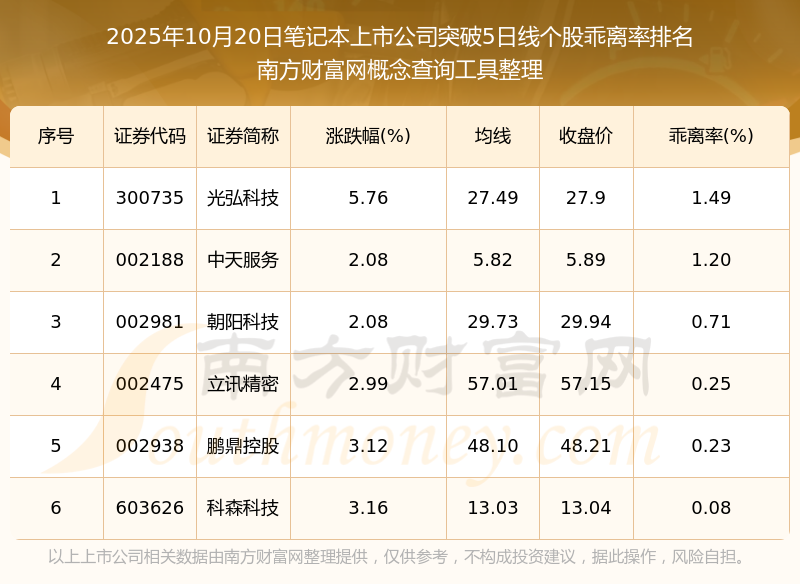 根據(jù)南方財富網(wǎng)概念查詢工具數(shù)據(jù)統(tǒng)計,截止2025年10月20日收盤,筆記本上市公司共有6只個股收盤價向上突破了5日線。其中乖離率較大的個股有光弘科技、中天服務、朝陽科技等,乖離率分別為1.49%、1.20%、0.71%。