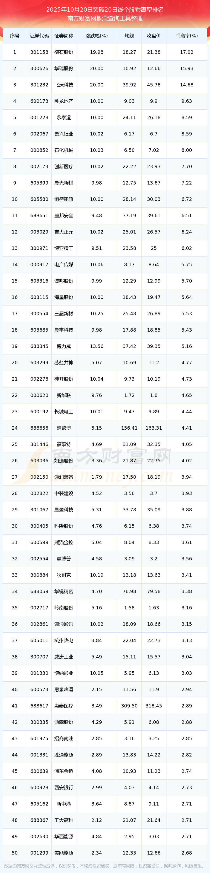 2025年10月20日突破20日線個(gè)股乖離率排名