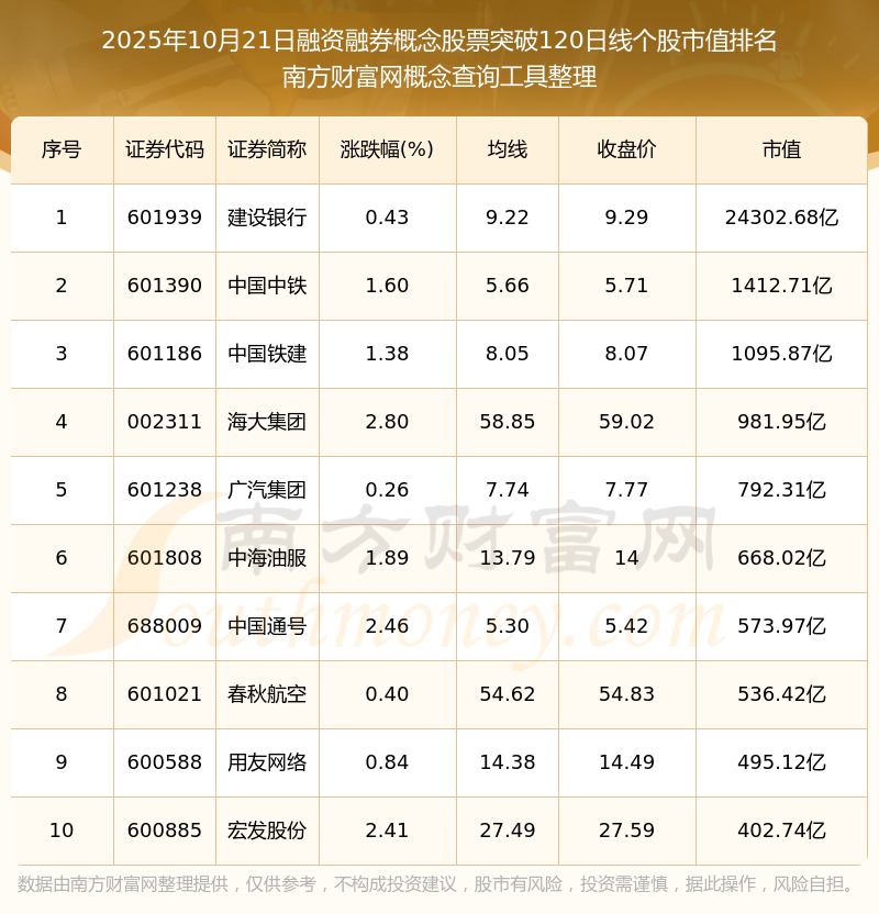 2025年10月21日融資融券概念股票突破120日線個(gè)股市值排名