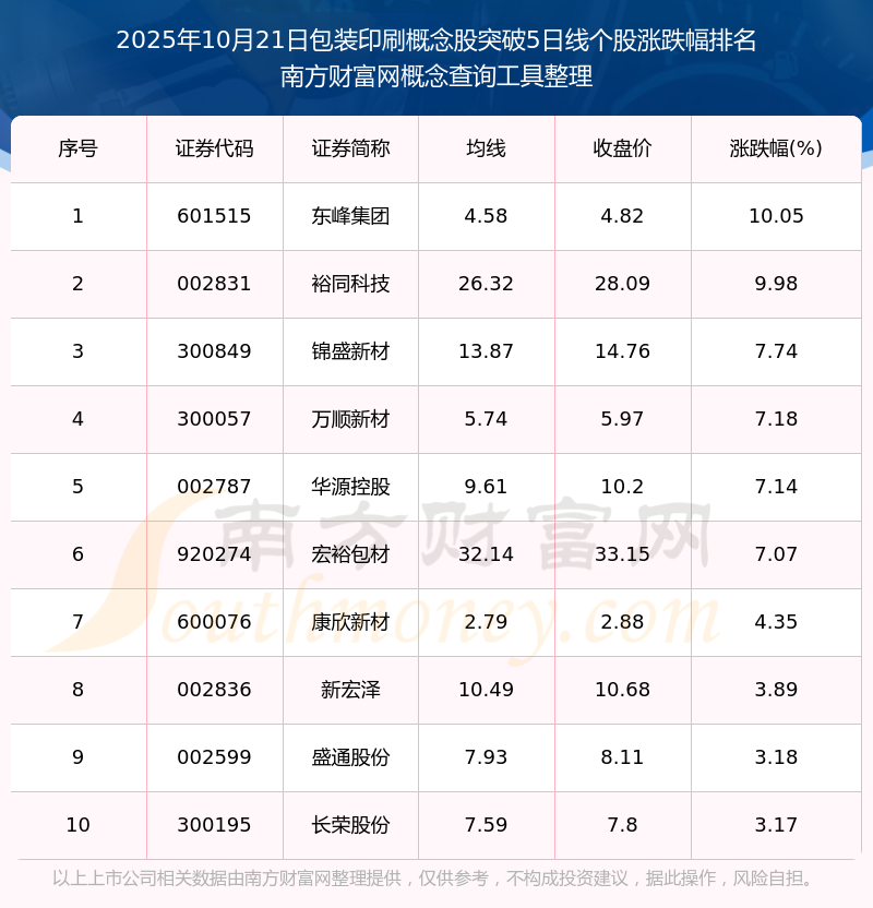 2025年10月21日包裝印刷概念股突破5日線個股漲跌幅排名