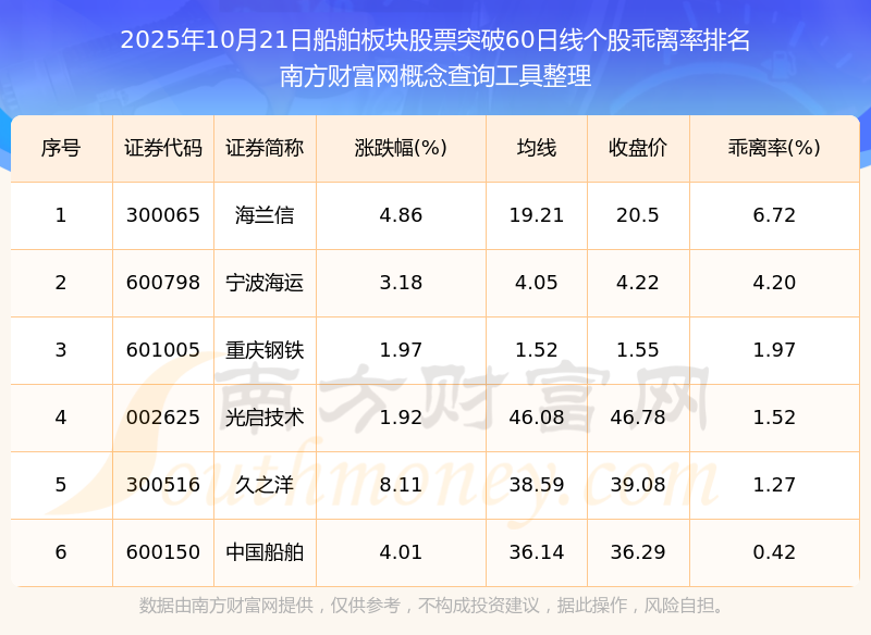 根據(jù)南方財富網(wǎng)概念查詢工具數(shù)據(jù)統(tǒng)計,截止2025年10月21日收盤,船舶板塊股票共有6只個股收盤價向上突破了60日線。其中乖離率較大的個股有海蘭信、寧波海運、重慶鋼鐵等,乖離率分別為6.72%、4.20%、1.97%。