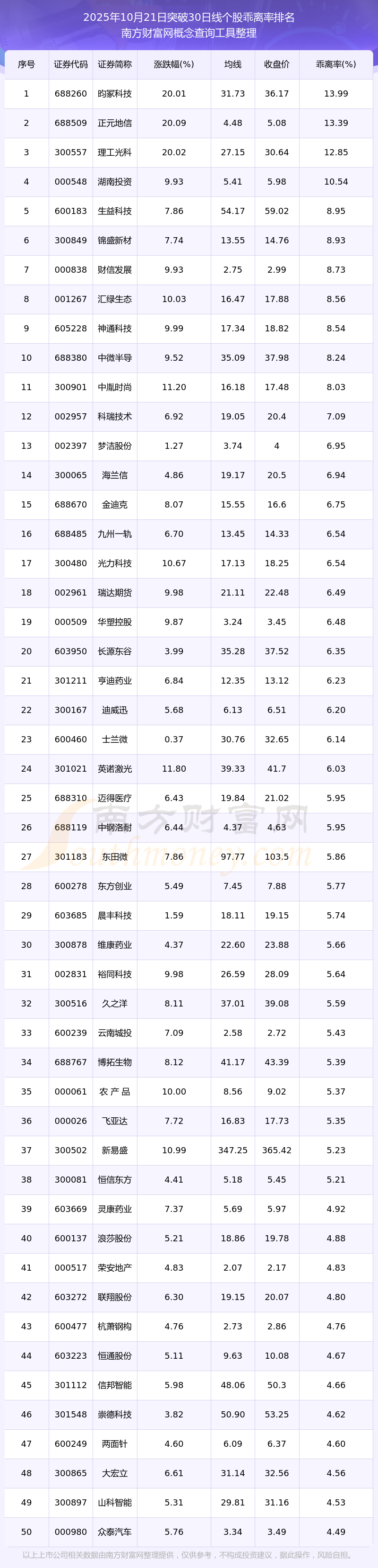 2025年10月21日突破30日線個(gè)股乖離率排名