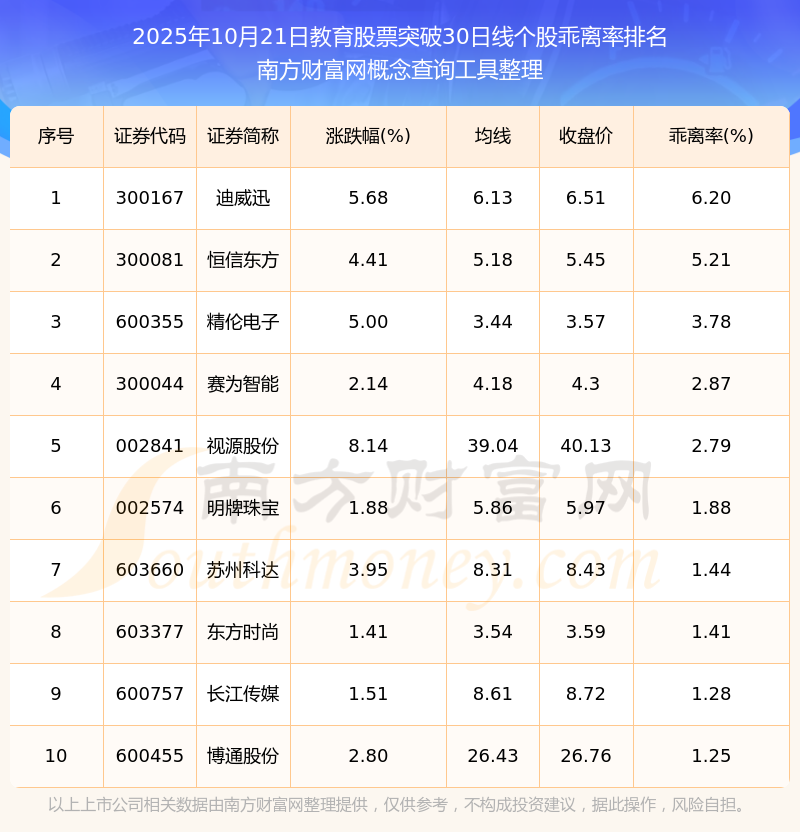 根據(jù)南方財富網(wǎng)概念查詢工具數(shù)據(jù)統(tǒng)計,截止2025年10月21日收盤,教育股票共有19只個股收盤價向上突破了30日線。其中乖離率較大的個股有迪威迅、恒信東方、精倫電子等,乖離率分別為6.20%、5.21%、3.78%。