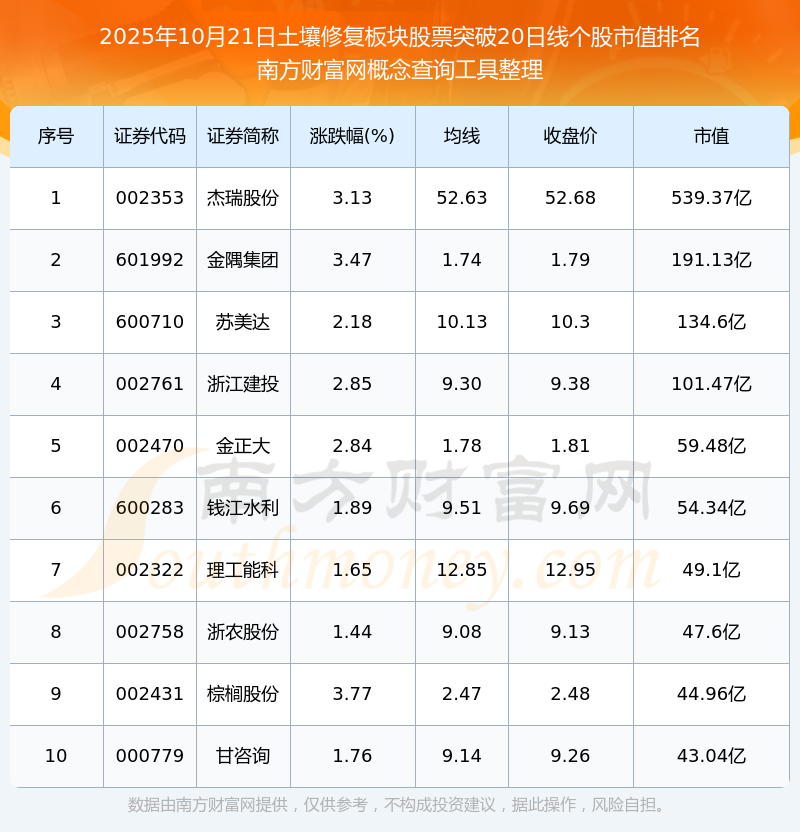 2025年10月21日土壤修復(fù)板塊股票突破20日線個(gè)股市值排名