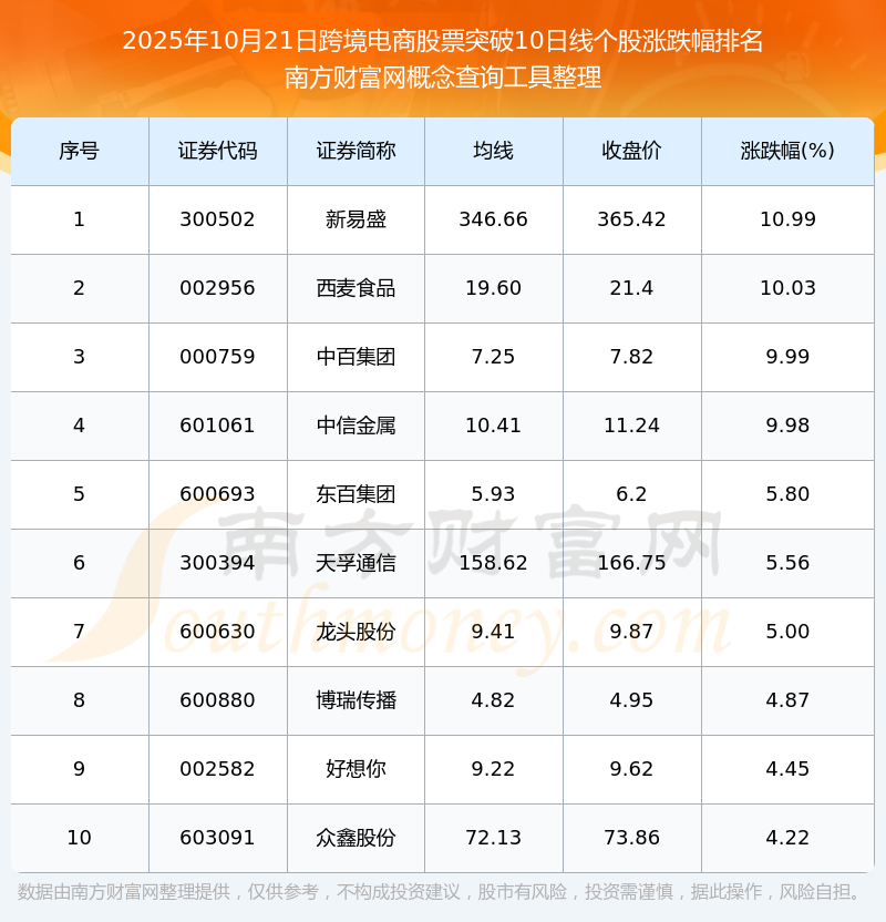 2025年10月21日跨境電商股票突破10日線個(gè)股漲跌幅排名