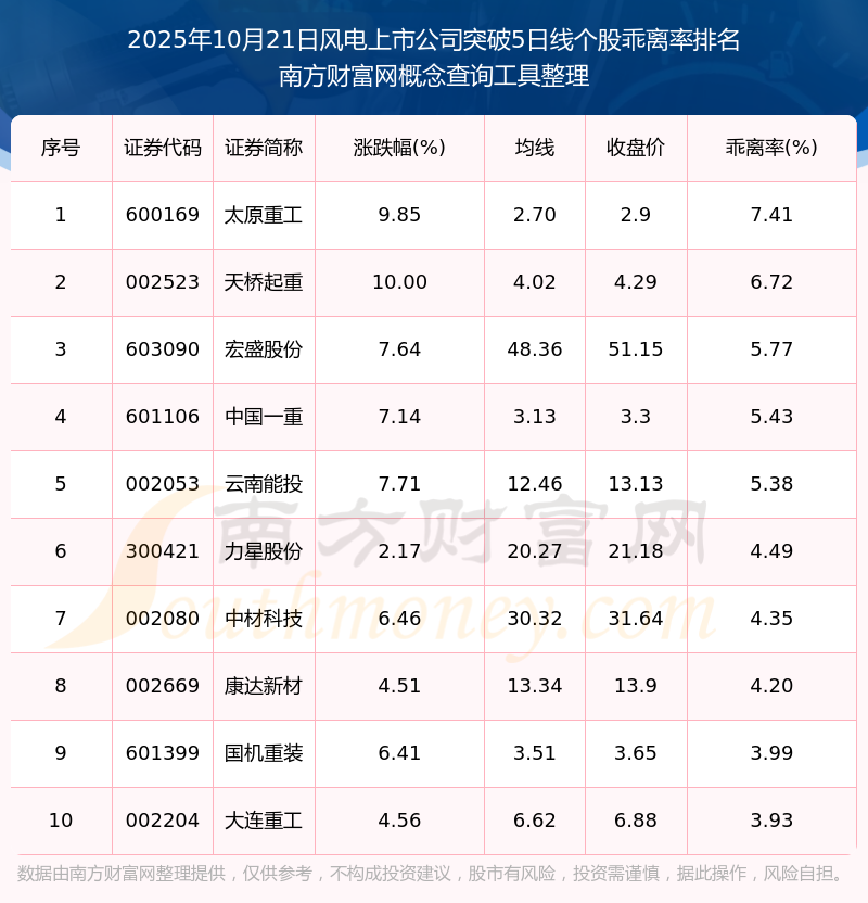 2025年10月21日風(fēng)電上市公司突破5日線個股乖離率排名