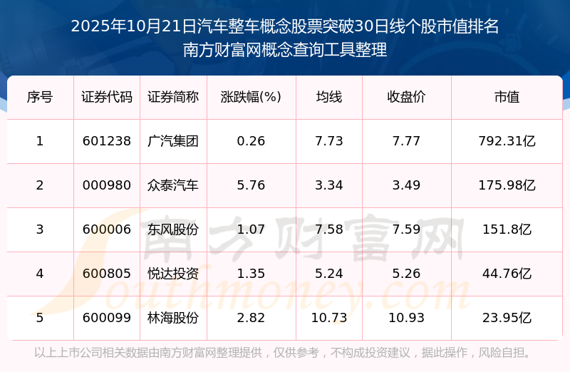 2025年10月21日汽車整車概念股票突破30日線個股市值排名