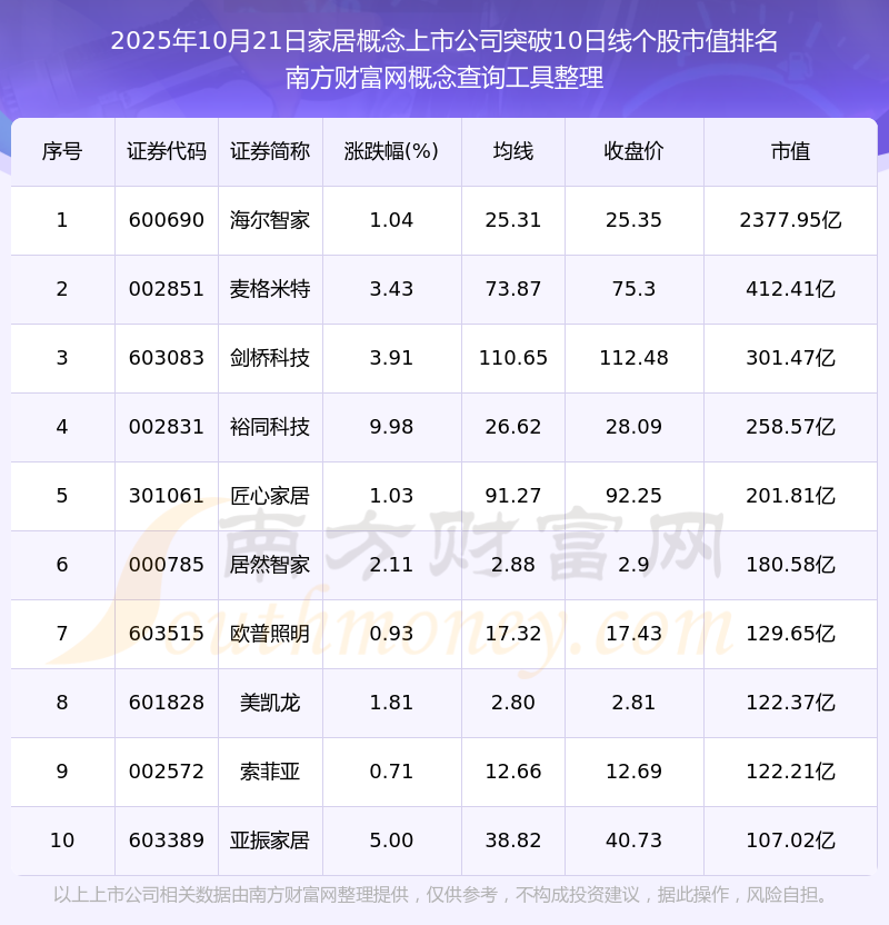 2025年10月21日家居概念上市公司突破10日線個股市值排名