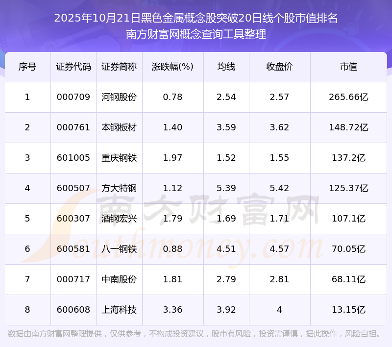 2025年10月21日黑色金屬概念股突破20日線個(gè)股市值排名