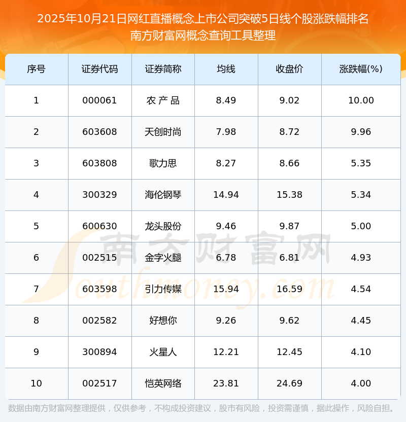 2025年10月21日網(wǎng)紅直播概念上市公司突破5日線個(gè)股漲跌幅排名