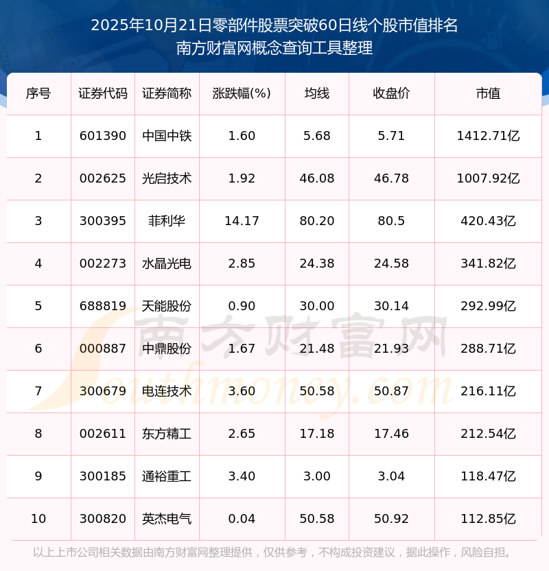2025年10月21日零部件股票突破60日線個(gè)股市值排名