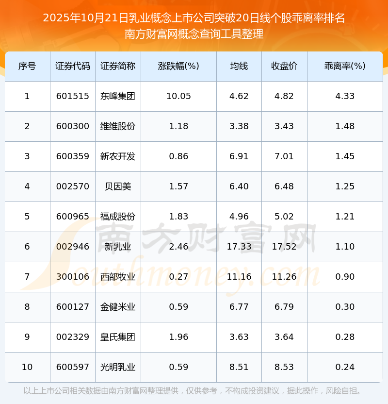 根據(jù)南方財富網(wǎng)概念查詢工具數(shù)據(jù)統(tǒng)計,截止2025年10月21日收盤,乳業(yè)概念上市公司共有10只個股收盤價向上突破了20日線。其中乖離率較大的個股有東峰集團、維維股份、新農(nóng)開發(fā)等,乖離率分別為4.33%、1.48%、1.45%。
