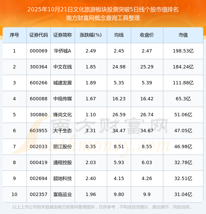 2025年10月21日文化旅游板塊股票突破5日線個股市值排名