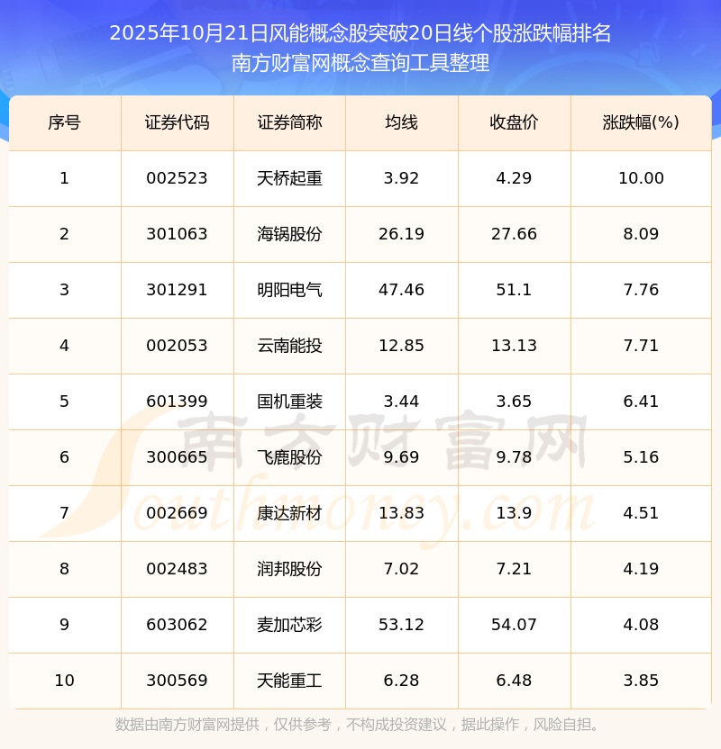 2025年10月21日風(fēng)能概念股突破20日線個(gè)股漲跌幅排名