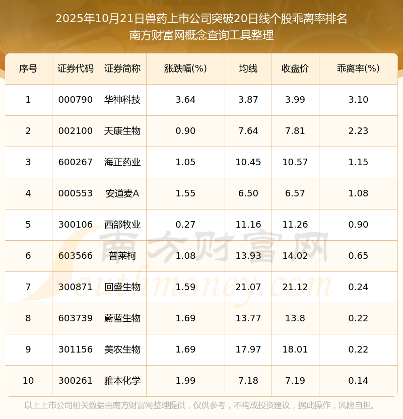 2025年10月21日獸藥上市公司突破20日線個股乖離率排名