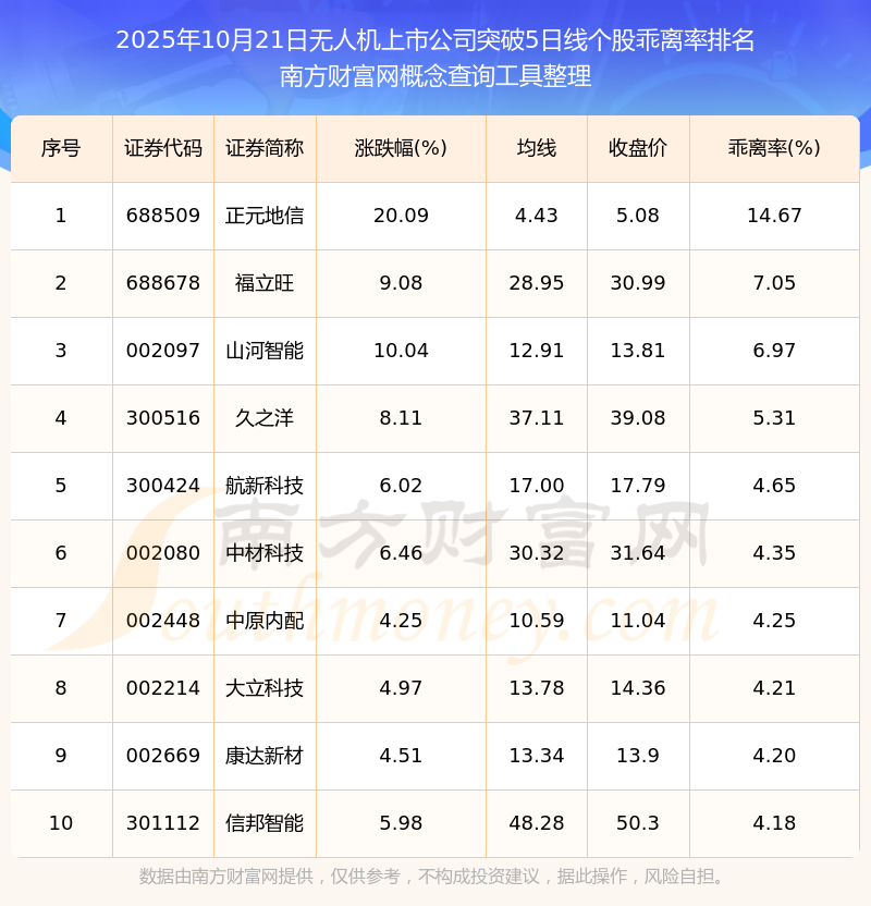 根據(jù)南方財富網(wǎng)概念查詢工具數(shù)據(jù)統(tǒng)計,截止2025年10月21日收盤,無人機上市公司共有132只個股收盤價向上突破了5日線。其中乖離率較大的個股有正元地信、福立旺、山河智能等,乖離率分別為14.67%、7.05%、6.97%。