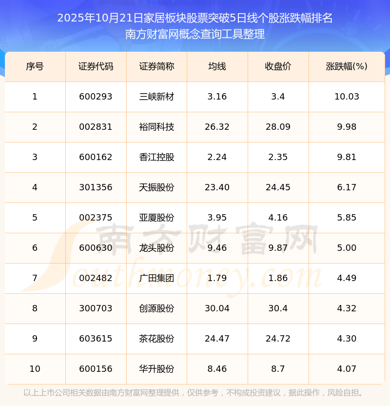 2025年10月21日家居板塊股票突破5日線個(gè)股漲跌幅排名
