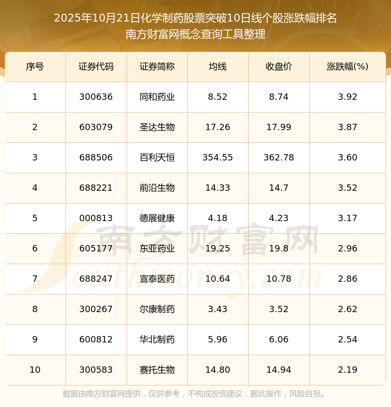 2025年10月21日化學(xué)制藥股票突破10日線個股漲跌幅排名