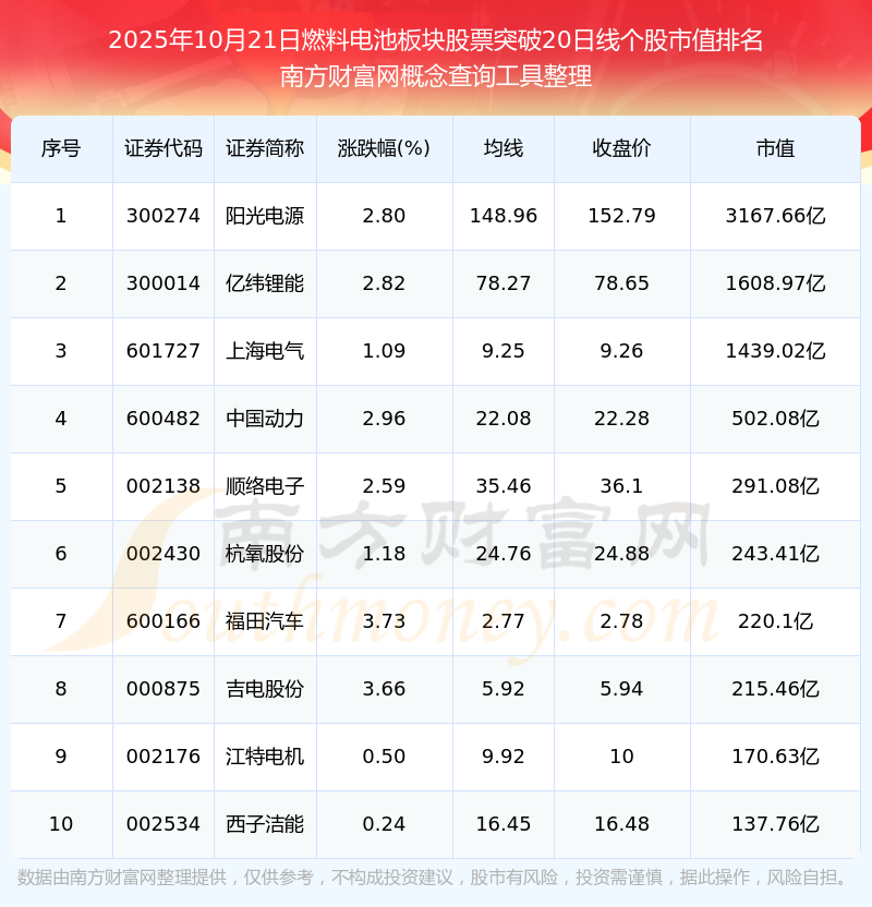 2025年10月21日燃料電池板塊股票突破20日線(xiàn)個(gè)股市值排名