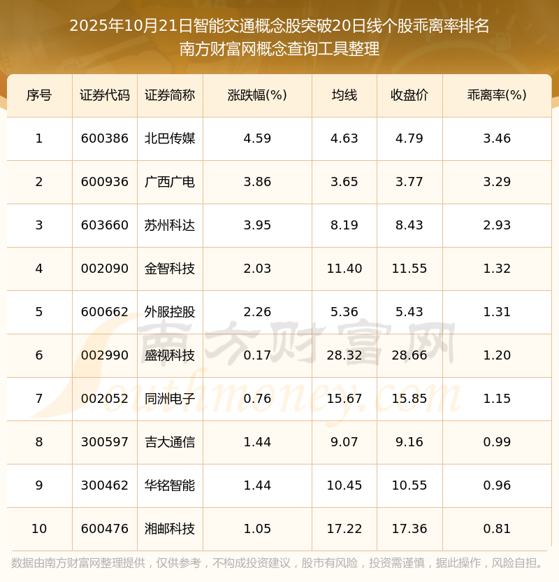 2025年10月21日智能交通概念股突破20日線個(gè)股乖離率排名