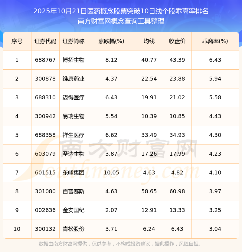 2025年10月21日醫(yī)藥概念股票突破10日線個股乖離率排名