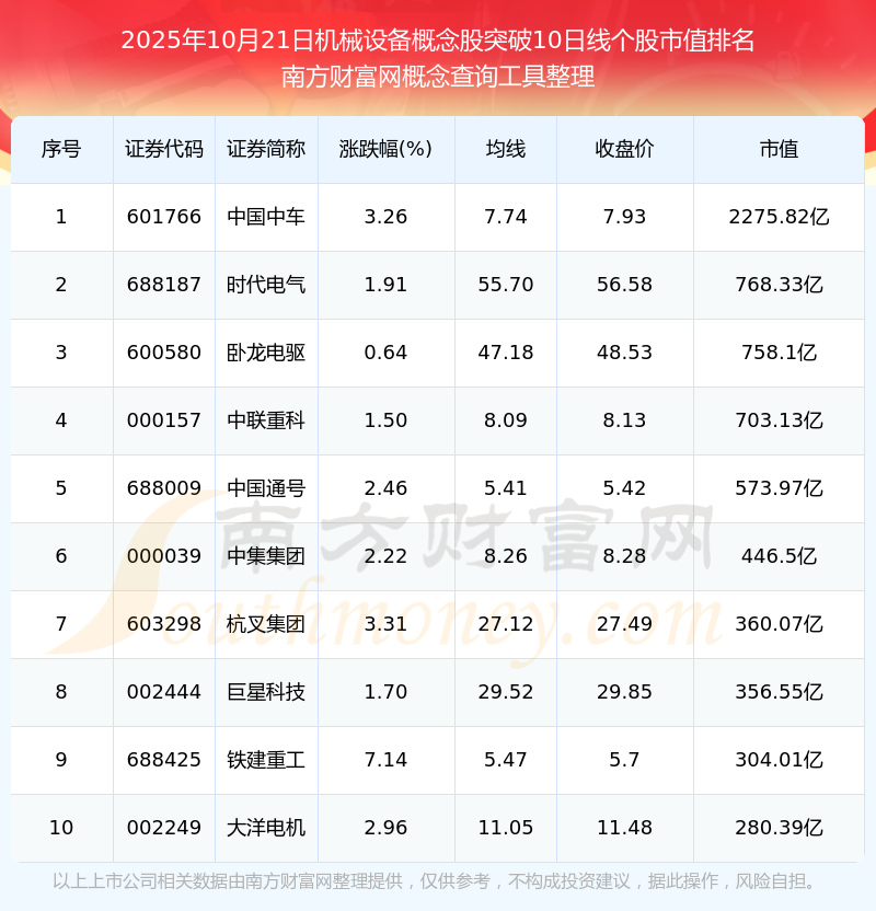 根據(jù)南方財富網(wǎng)概念查詢工具數(shù)據(jù)統(tǒng)計,截止2025年10月21日收盤,機械設備概念股共有173只個股收盤價向上突破了10日線。其中市值較大的個股有中國中車、時代電氣、臥龍電驅(qū)等,市值分別為2275.82億、768.33億、758.1億。