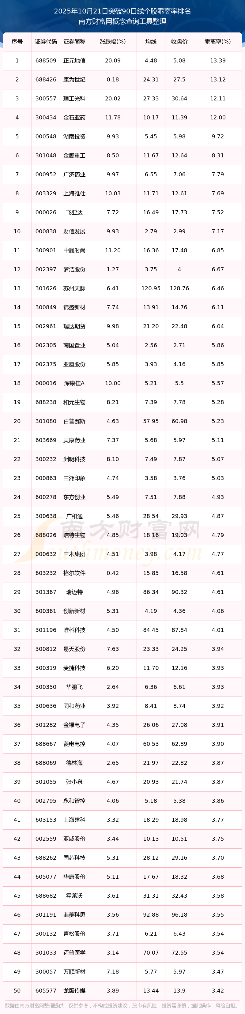 2025年10月21日突破90日線個(gè)股乖離率排名