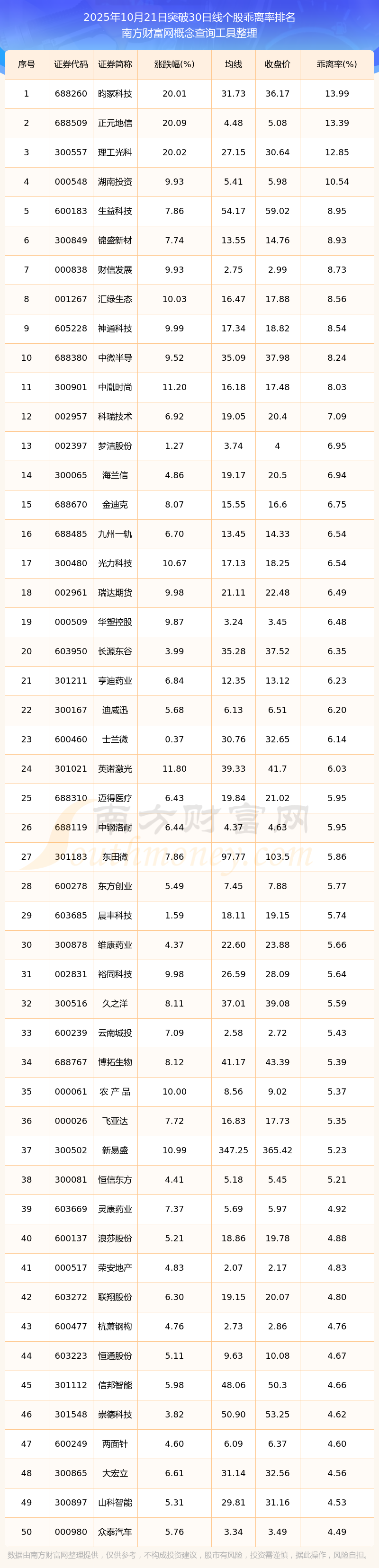 2025年10月21日突破30日線個(gè)股乖離率排名