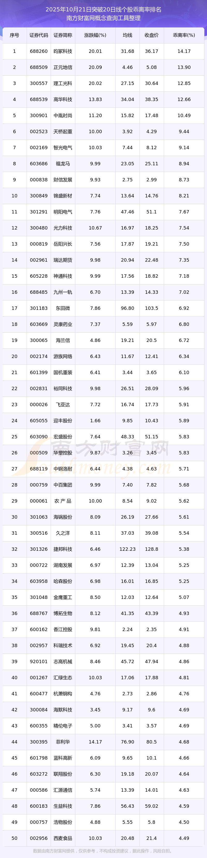 2025年10月21日突破20日線(xiàn)個(gè)股乖離率排名