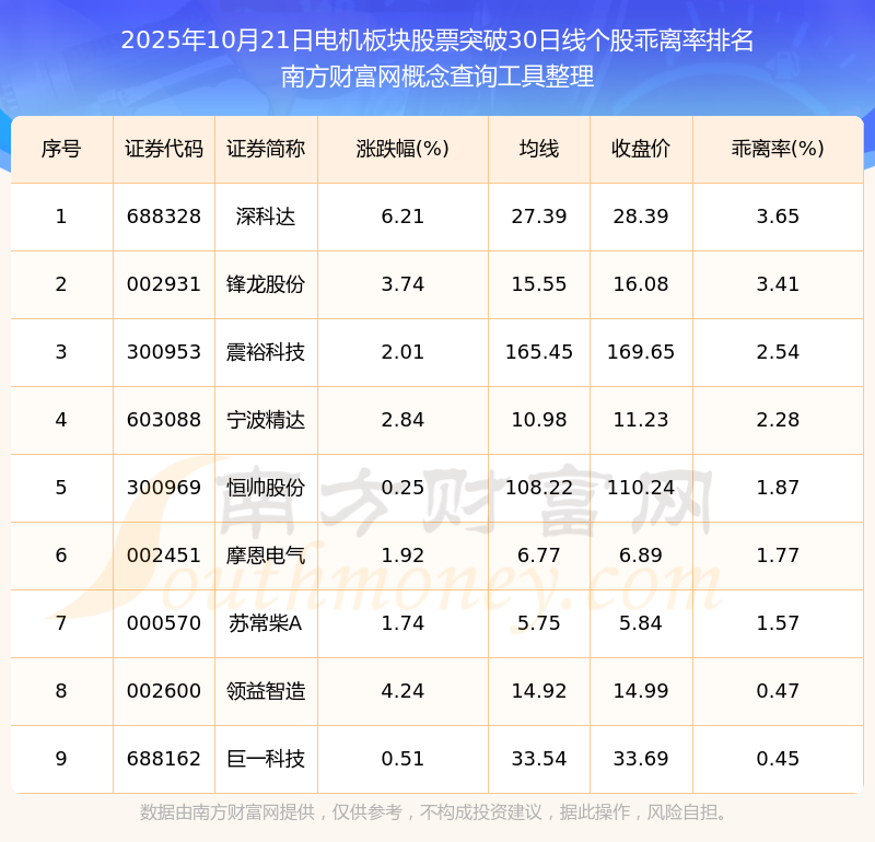 根據(jù)南方財富網(wǎng)概念查詢工具數(shù)據(jù)統(tǒng)計,截止2025年10月21日收盤,電機板塊股票共有9只個股收盤價向上突破了30日線。其中乖離率較大的個股有深科達(dá)、鋒龍股份、震?萍嫉,乖離率分別為3.65%、3.41%、2.54%。