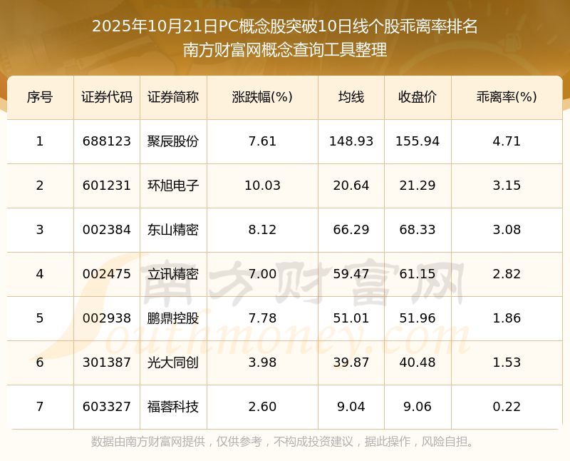 根據南方財富網概念查詢工具數據統計,截止2025年10月21日收盤,PC概念股共有7只個股收盤價向上突破了10日線。其中乖離率較大的個股有聚辰股份、環(huán)旭電子、東山精密等,乖離率分別為4.71%、3.15%、3.08%。