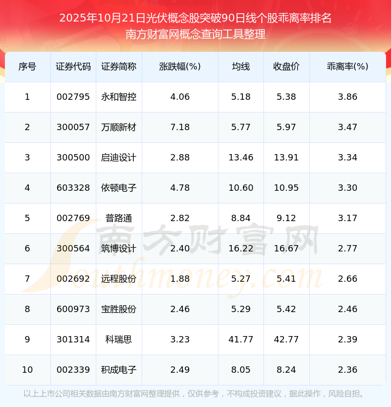根據(jù)南方財富網(wǎng)概念查詢工具數(shù)據(jù)統(tǒng)計,截止2025年10月21日收盤,光伏概念股共有52只個股收盤價向上突破了90日線。其中乖離率較大的個股有永和智控、萬順新材、啟迪設計等,乖離率分別為3.86%、3.47%、3.34%。