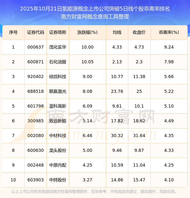 2025年10月21日氫能源概念上市公司突破5日線個(gè)股乖離率排名
