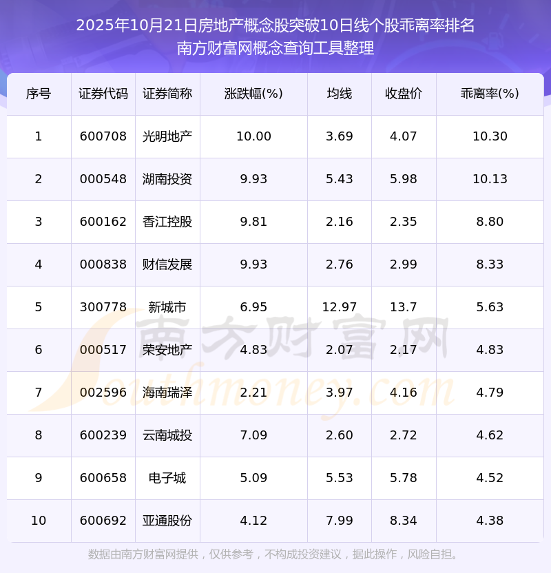 2025年10月21日房地產(chǎn)概念股突破10日線個(gè)股乖離率排名