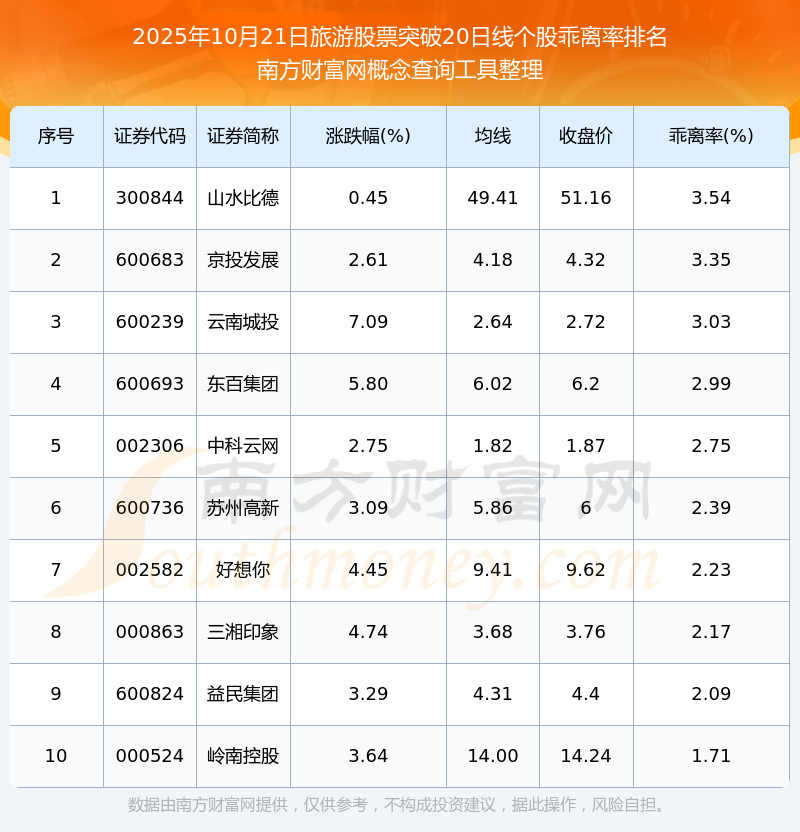2025年10月21日旅游股票突破20日線個(gè)股乖離率排名