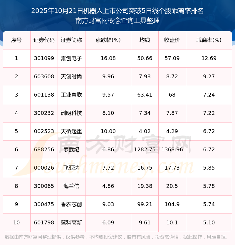 2025年10月21日機(jī)器人上市公司突破5日線個(gè)股乖離率排名