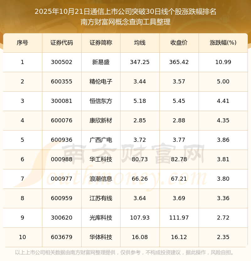 2025年10月21日通信上市公司突破30日線個(gè)股漲跌幅排名