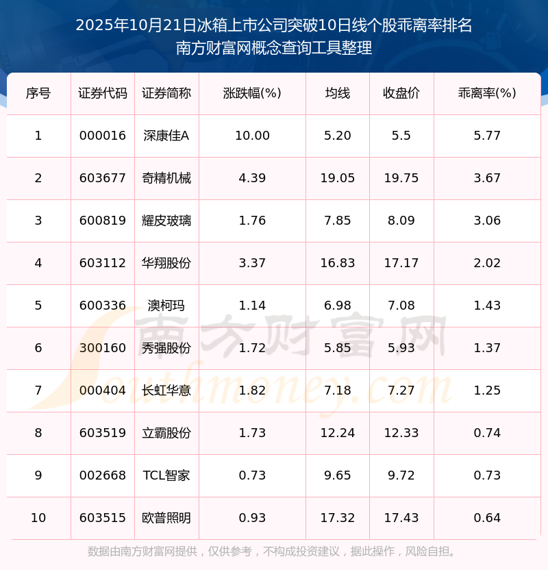 根據(jù)南方財富網(wǎng)概念查詢工具數(shù)據(jù)統(tǒng)計,截止2025年10月21日收盤,冰箱上市公司共有13只個股收盤價向上突破了10日線。其中乖離率較大的個股有深康佳A、奇精機械、耀皮玻璃等,乖離率分別為5.77%、3.67%、3.06%。