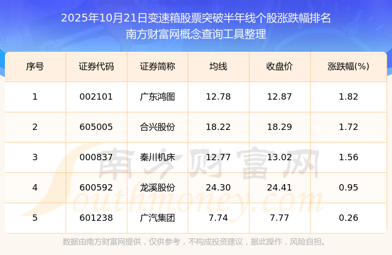 2025年10月21日變速箱股票突破半年線個股漲跌幅排名