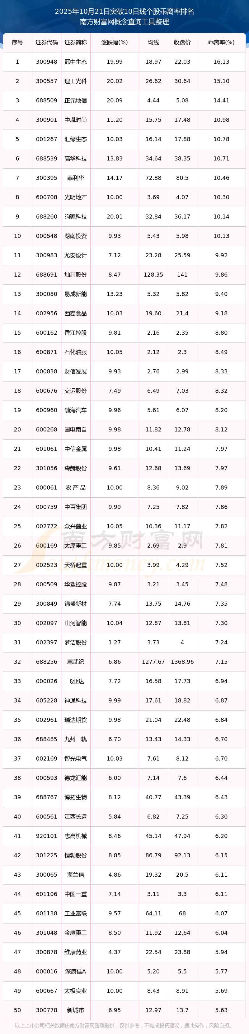 2025年10月21日突破10日線個(gè)股乖離率排名