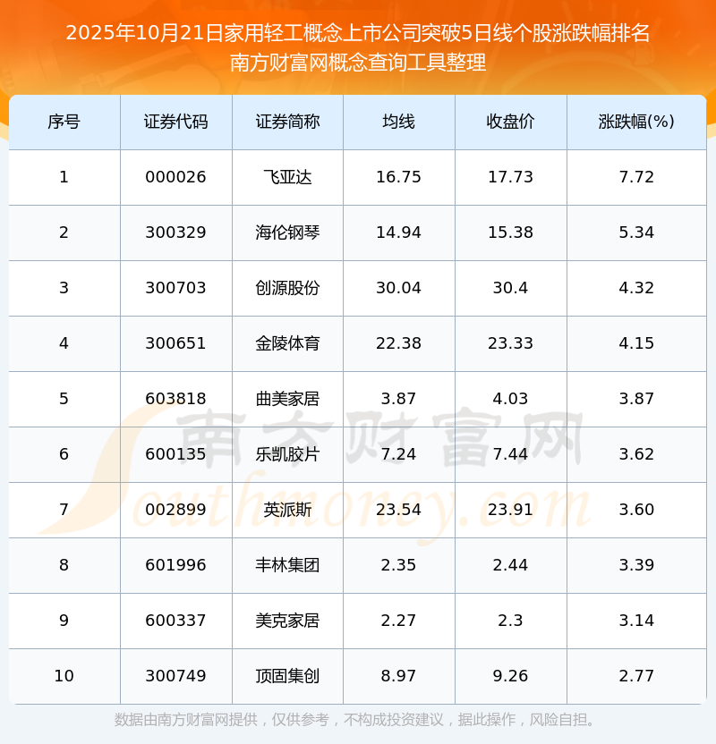 根據(jù)南方財富網(wǎng)概念查詢工具數(shù)據(jù)統(tǒng)計,截止2025年10月21日收盤,家用輕工概念上市公司共有38只個股收盤價向上突破了5日線。其中漲幅較大的個股有飛亞達(dá)、海倫鋼琴、創(chuàng)源股份等,漲幅分別為7.72%、5.34%、4.32%。