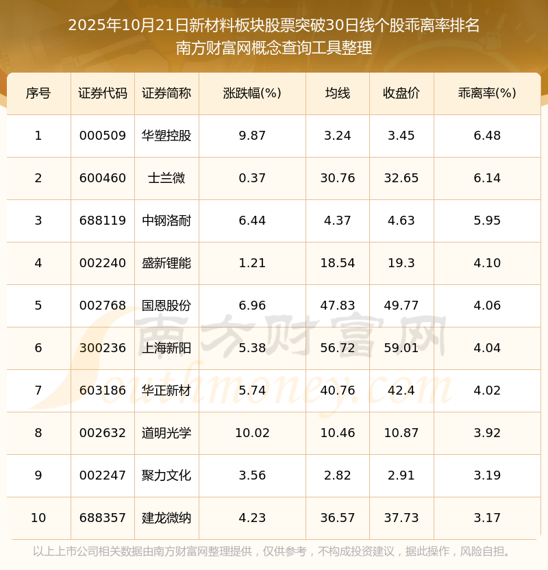 2025年10月21日新材料板塊股票突破30日線個股乖離率排名
