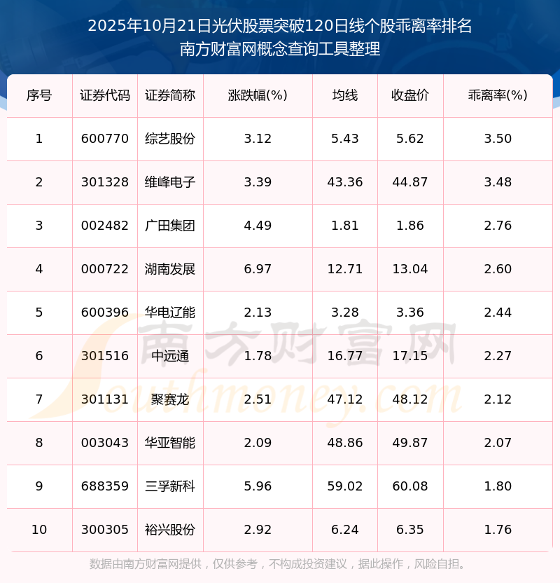 根據(jù)南方財(cái)富網(wǎng)概念查詢工具數(shù)據(jù)統(tǒng)計(jì),截止2025年10月21日收盤(pán),光伏股票共有33只個(gè)股收盤(pán)價(jià)向上突破了120日線。其中乖離率較大的個(gè)股有綜藝股份、維峰電子、廣田集團(tuán)等,乖離率分別為3.50%、3.48%、2.76%。