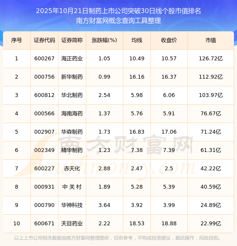 2025年10月21日制藥上市公司突破30日線個股市值排名